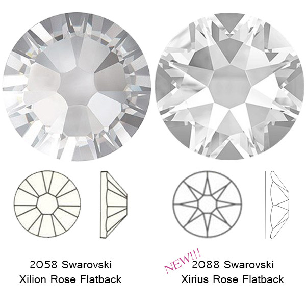 Пропонуємо на вибір клейові стрази холодної фіксації в ограновуванні 2058 Xilion (14 граней, високі межі, вузький верхній фацет) і 2088 Xirius Rose (16граней, трохи нижче висота кристала, змінена покращена ограновування).