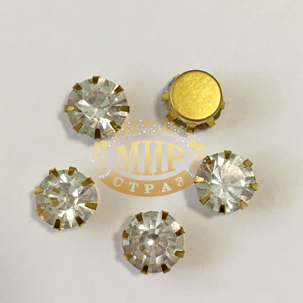 Камені в оправі золотого кольору ( стрази в золотих цапах).Діаметр стрази 8мм