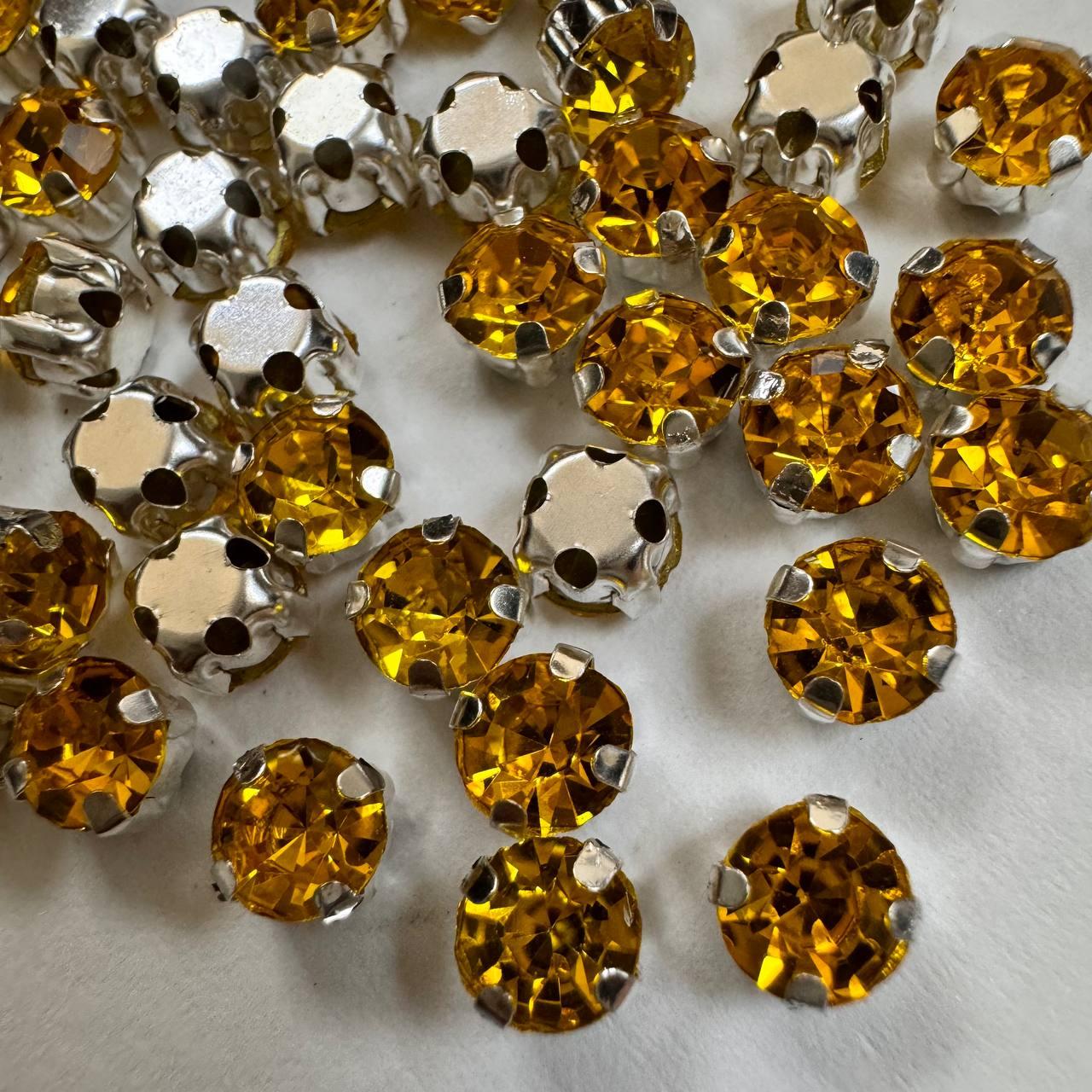 Страза має конусне дно та посаджена в металеве ложе (цапа) срібного кольору. Пришиється мононитку або ниткою для шкіри через отвори в цапі. Підходять для декорування взуття, одягу, сумок, обідків для волосся та ін.